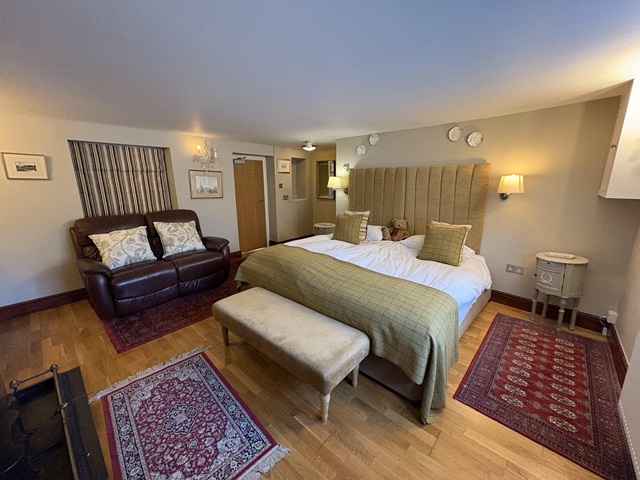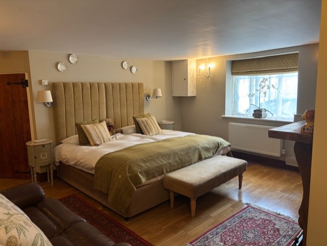 We have one queen superior room with corner whirlpool bath with shower above and a private patio garden with chairs to relax in. The family suite is a king bedroom and a separate twin bedroom with private bathroom with a p shaped bath and shower above. Both rooms have a view over the village green.